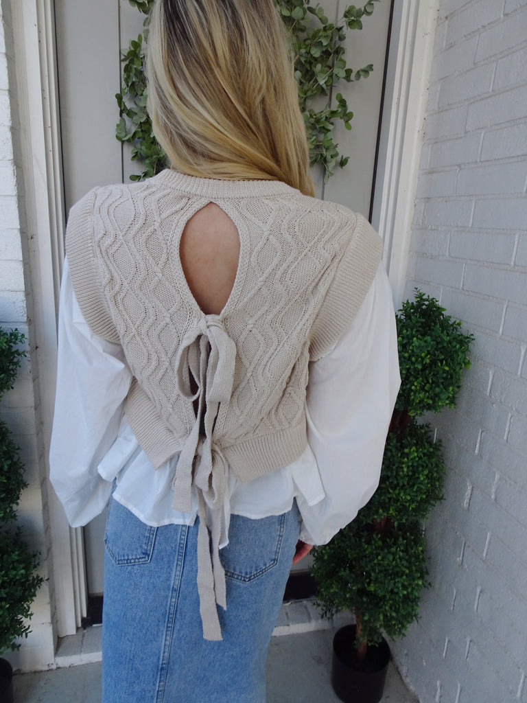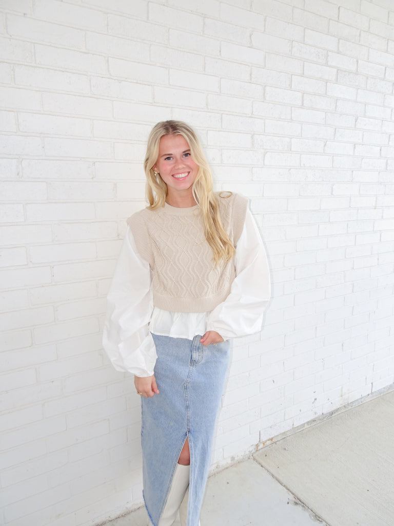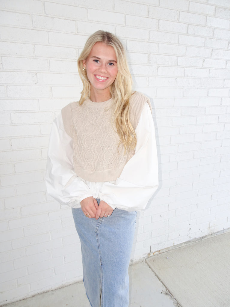 Karli Top - This top is so cute and perfect for the season! It has a beige vest that is open in the back with two places that tie the shirt together. It also has white balloon sleeves, making this the perfect shirt to add to your closet! This shirt is comfortable, cute, and perfect to be paired with many different bottoms and shoes. Shop the Karli Top today!