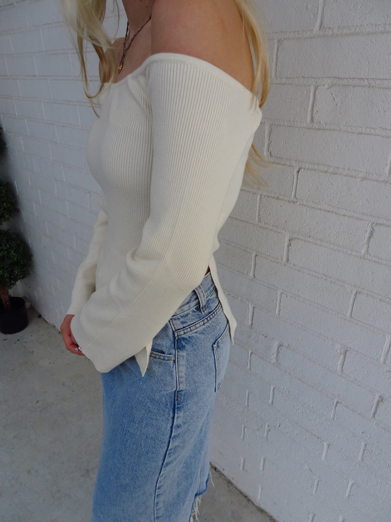 Kayla Off the Shoulder Top - This cream off the shoulder top is so cute! We love the small ribbed detailing and the slit to one side of the shirt, making it unique! This top can be dressed up or down with jeans or a cute skirt! Shop the Kayla Top today!