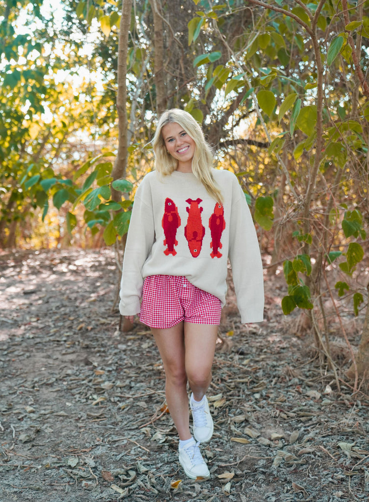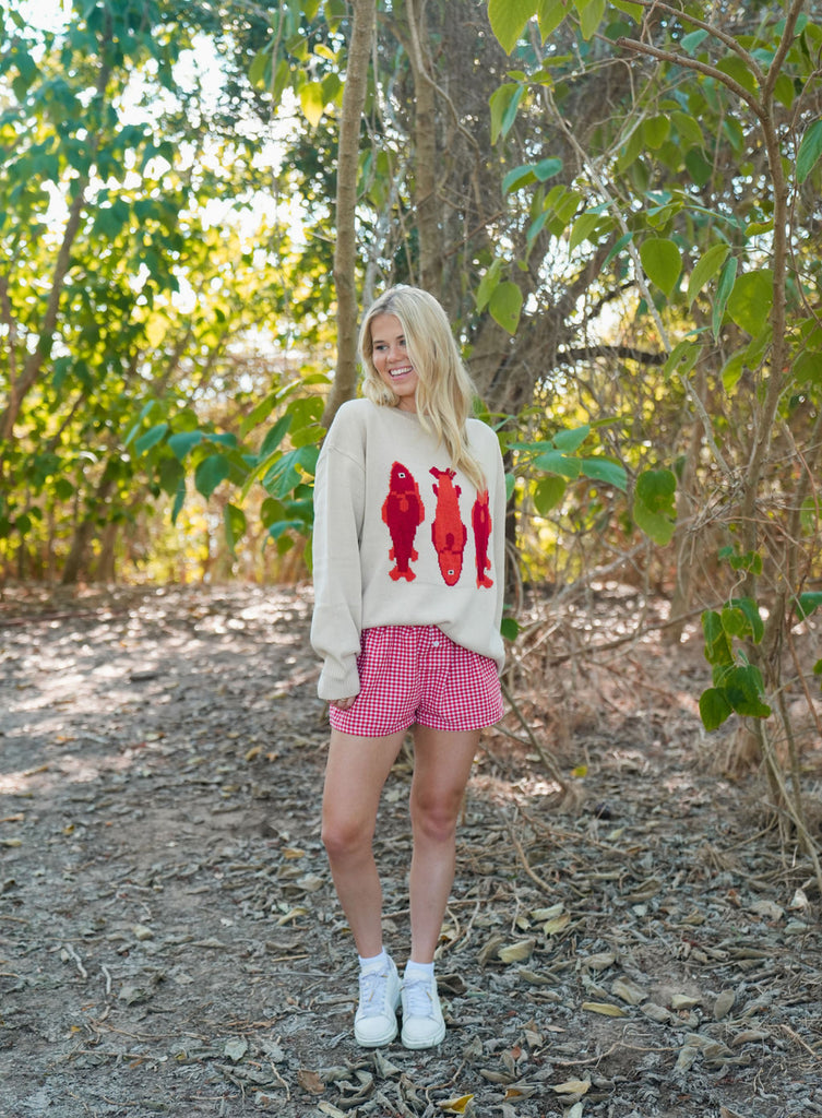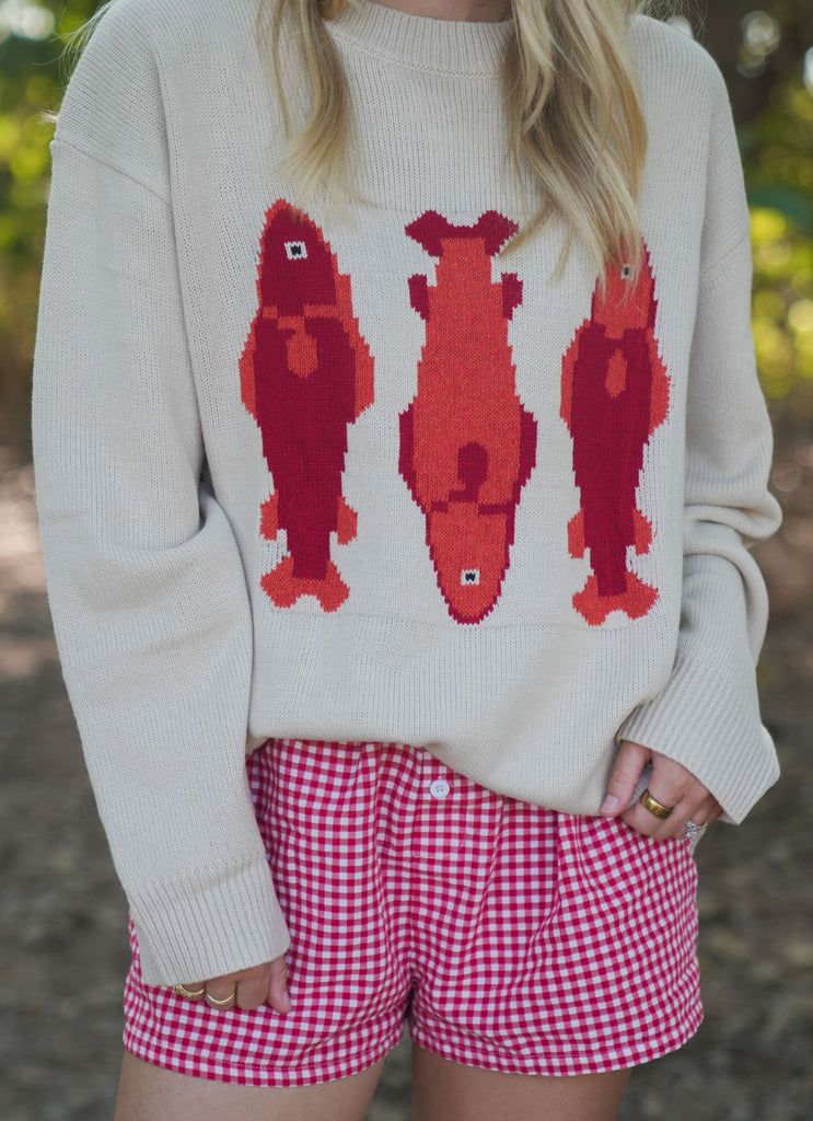 Lucky Catch Sweater - Soft, cozy, and full of charm-the Lucky Catch Sweater is your perfect seasonal knit. Designed in a cream base and adorned with a trio of bold red fish, this whimsical graphic sweater brings a touch of fun to everyday style. Whether you pair it with gingham boxer shorts, classic denim, or your favorite bottoms, it's an easy piece to dress up or keep casual.