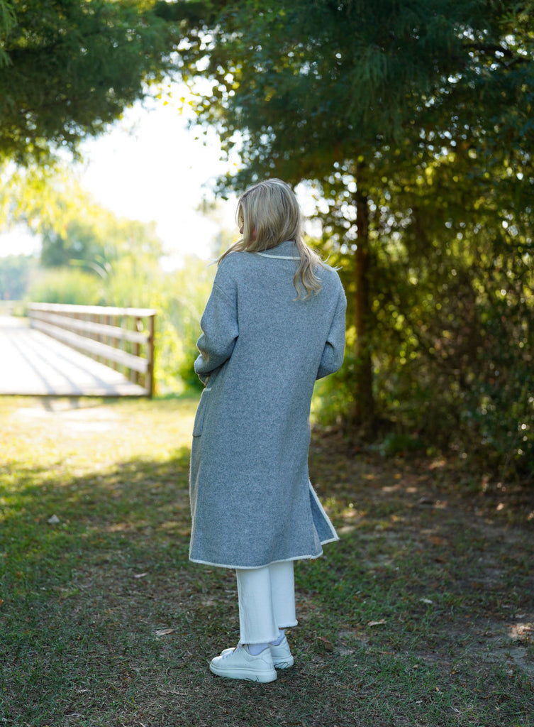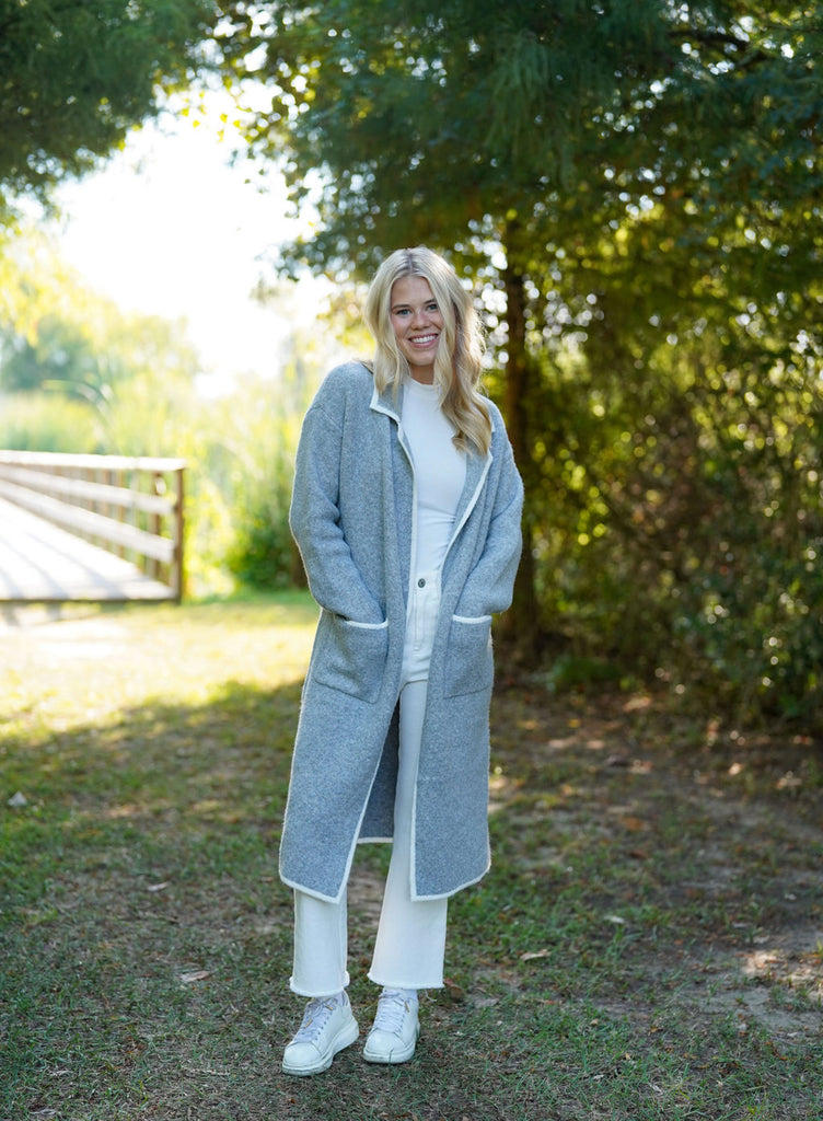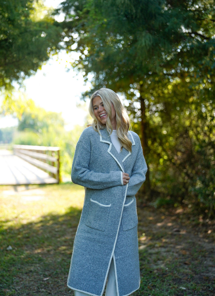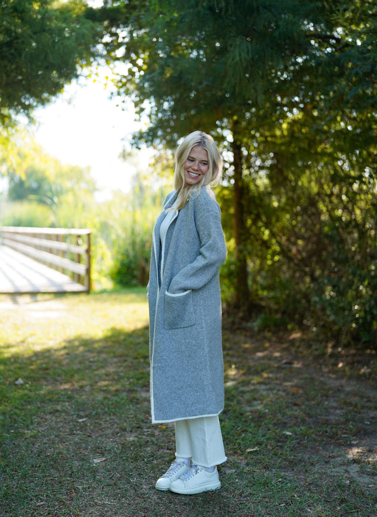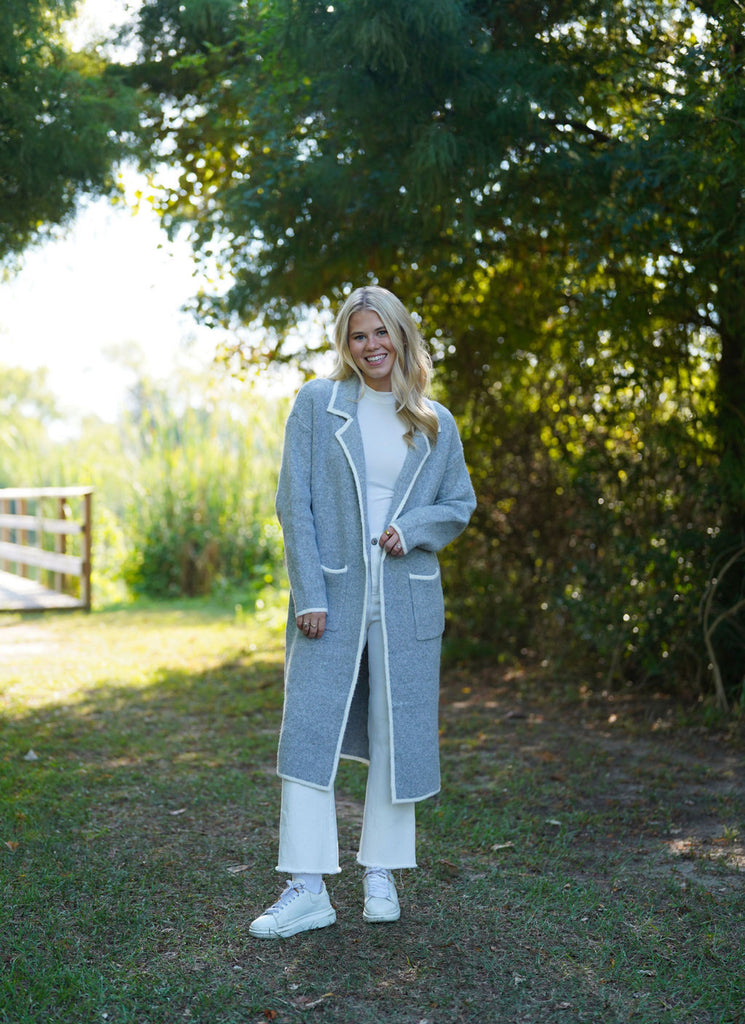 Nora Collared Cardigan - Meet your new seasonal favorite: the Nora Collared Cardigan. This midi-length gray knit is soft, cozy, and effortlessly stylish, with crisp white border detailing that makes it stand out. Functional front pockets and a classic collared design add versatility, making it easy to layer over anything in your wardrobe. Perfect for the season, this cardigan is as unique as it is wearable—you'll find yourself reaching for it again and again!