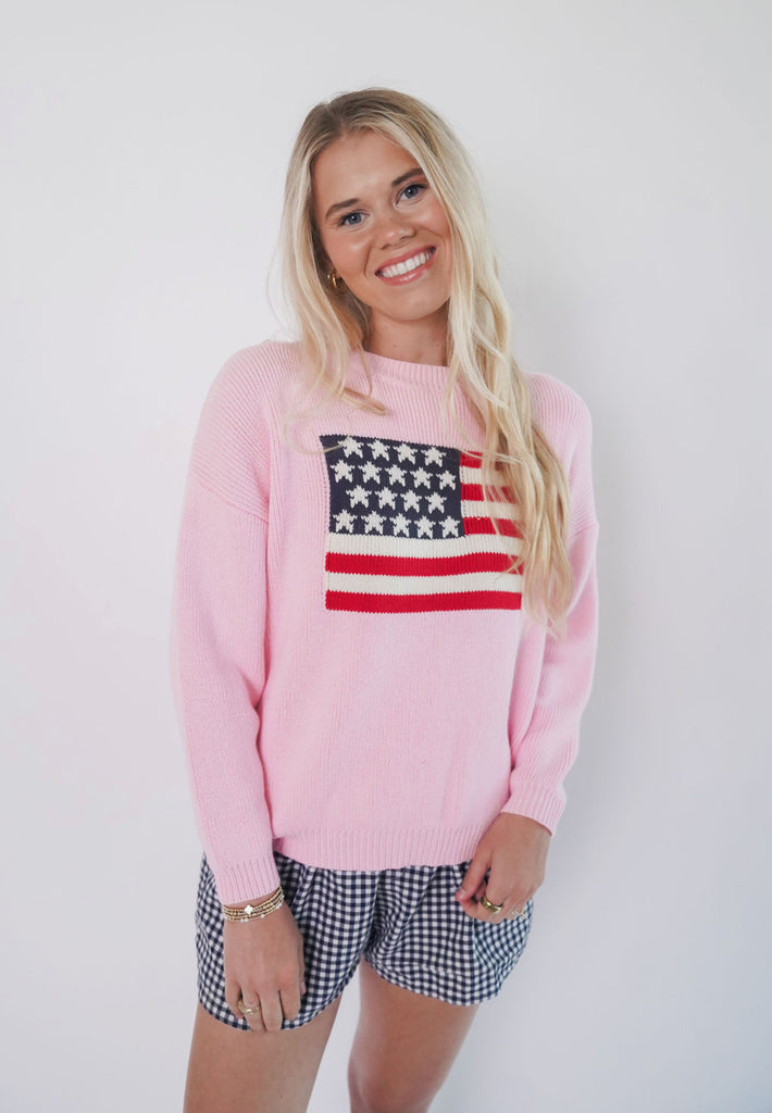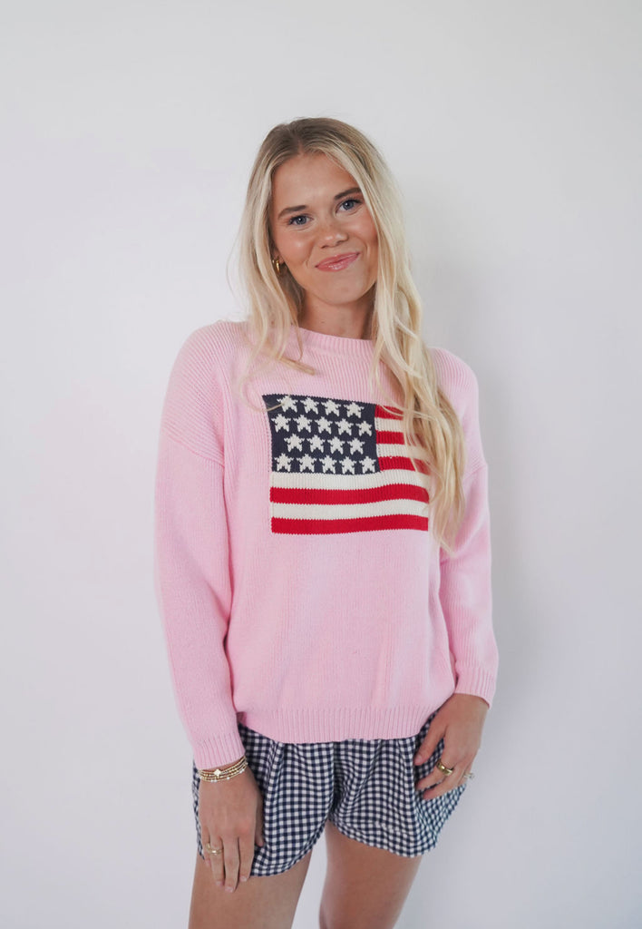 Pink American Flag Top - This pink, soft, long sleeve sweater features a patriotic American flag! Perfect for cool evenings, casual weekends or layering all year-round!