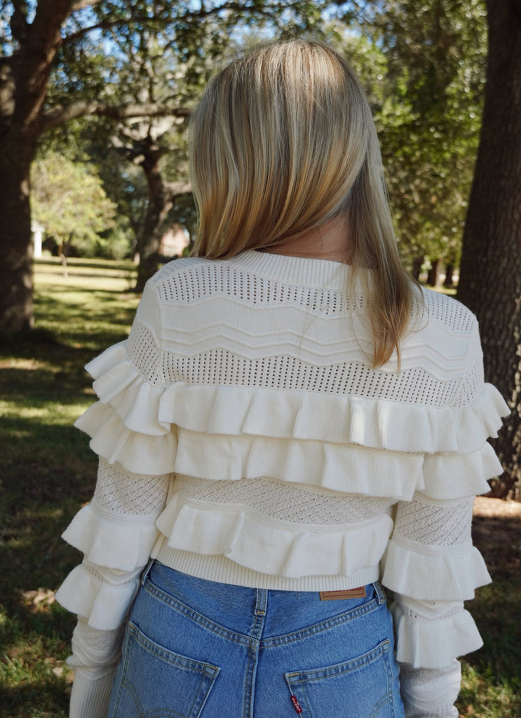 Rachel Button Up Sweater - We are obsessed with this button up sweater has the prettiest pattern and ruffle detailing! It is perfect for this Fall and Winter and could be paired with jeans or a cute skirt! Don't miss out on this cute sweater!