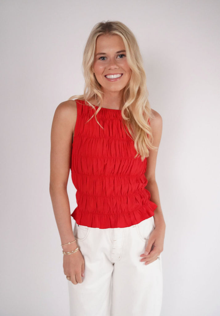 Rose Marie Top - Bold, flattering, and made to stand out! This vibrant red top features smocked detailing for a perfect textured fit that adds charm to any outfit. Pair it with jeans, shorts, or a skirt - it’s your go-to for any occasion!