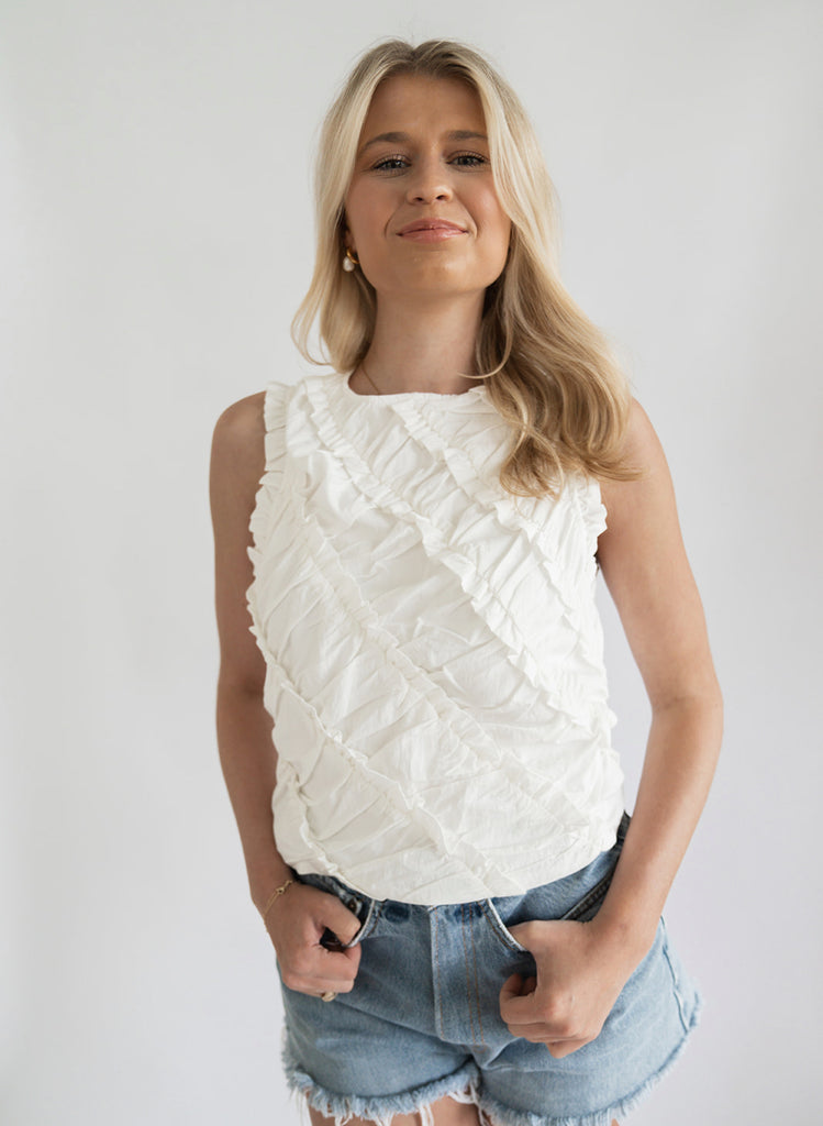 Tatum Top - This white tank top is so cute! Its ruffled detailing and stitching make this top unique. This top is double lined with a back midline zipper. Perfect for any occasion! Get your Tatum top today!