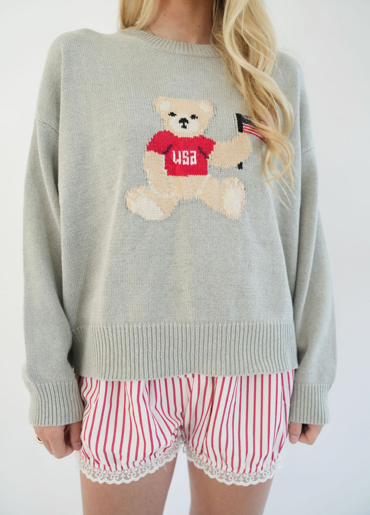 Teddy American Flag Sweater - This light gray sweater stands out with its unique Teddy and USA detailing - the perfect mix of fun and patriotic! Lightweight and versatile, it pairs easily with shorts, jeans, or a skirt.
