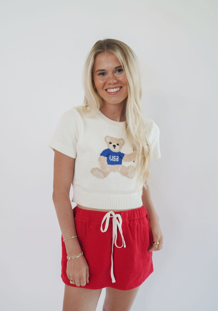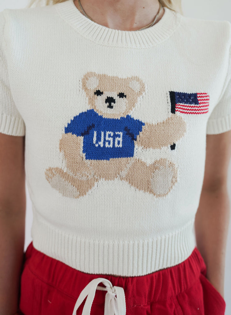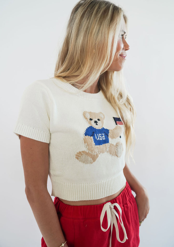 Teddy Cream American Top - Cute and easy to style, the Teddy Cream American Top stands out with its unique Teddy and USA detailing. Perfect with sneakers for a laid-back, fun look.