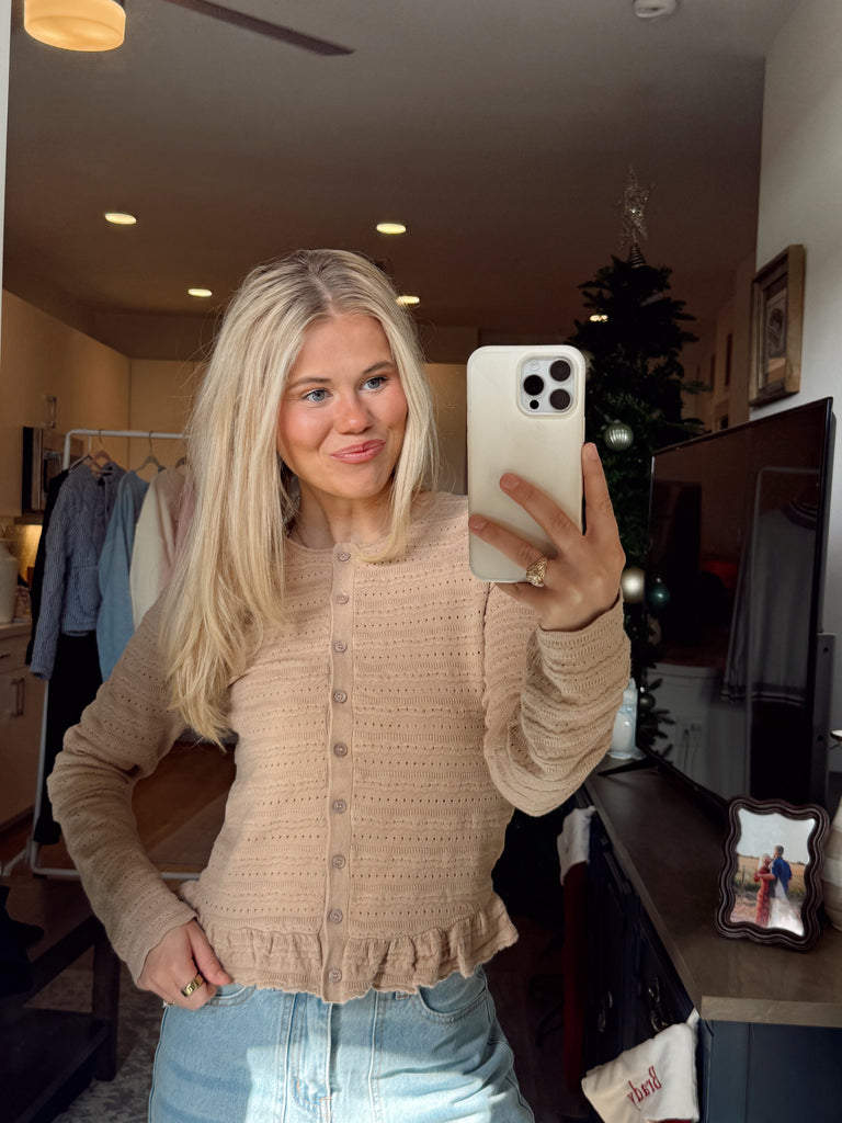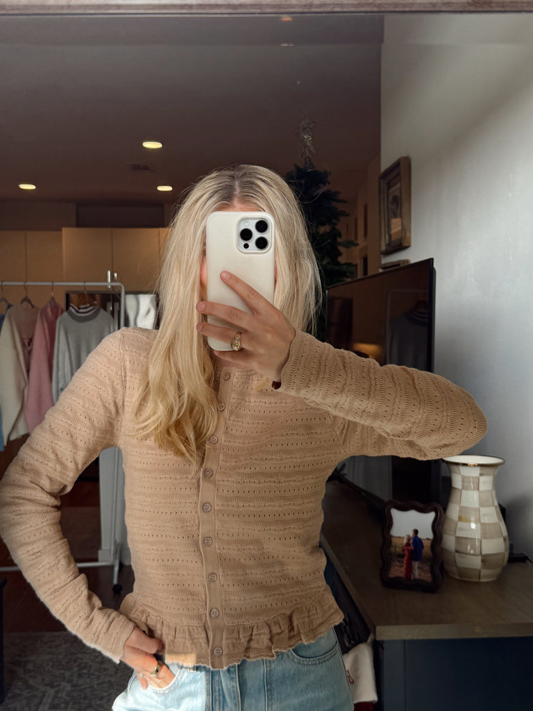 Caroline Cardigan - The Caroline Cardigan is an adorable, uniquely textured beige pointelle piece that adds effortless style to any wardrobe. Featuring a delicate ruffle hem and classic midline button closure, this soft and comfortable cardigan is as versatile as it is chic. Wear it solo or layer it for added dimension-perfectly dressed up with a skirt for an evening out or styled with denim for a casual, everyday look. A standout piece that combines comfort, texture, and timeless elegance.