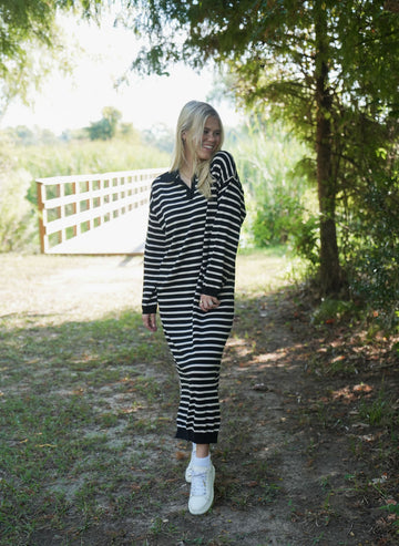 Kori Striped Maxi Dress - Effortless style meets all-day comfort in the Kori Striped Maxi Dress. Crafted in a cozy soft black fabric with subtle beige stripes, this collared maxi is designed to take you anywhere with ease. It’s relaxed yet flattering fit makes it perfect for the office, a casual lunch with friends, or dressed up for an evening out. This versatile dress pairs beautifully with sneakers, boots, or your favorite heels. From office hours to after hours, the Kori Striped Maxi Dress has you covered in comfort and style!
