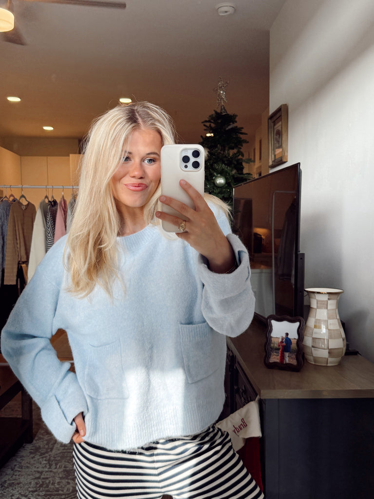 Maddie Top - Stay effortlessly stylish in the Madi Top —a beautifully soft and comfortable sky-blue sweater perfect for the season. Designed with two functional front pockets and a classic crew neckline, it stands out with uniquely detailed sleeve cuffs that add a charming, modern touch. Versatile and easy to style, this adorable sweater can be dressed up or down, making it the perfect choice for any occasion.